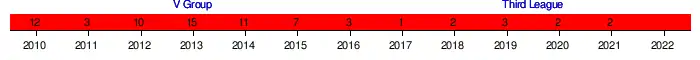 Green marks a season followed by promotion, red a season followed by relegation.