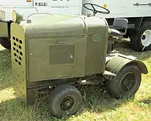 In 1935, Hibberd diversified with the production of a light wheeled tractor for use in or between factories, or on the road.[4] This was available initially with a 4-cylinder petrol engine and either pneumatic or solid tyres - layout was conventional with front steering and driven rear axle. The Hibberd light truck was introduced in 1937 with the Model B (of 2 ton capacity) and Model C (of 25-30 cwt capacity) - which were available with fixed or elevating load platforms and with 8 hp petrol or 10 hp horizontally opposed oil engines.[5] Steering and driving was by the closely spaced front wheels. The original tractor design continued in production during and after WW2 and was available with a variety of engines, including a Ford 4-cylinder industrial petrol engine or an oil engine. A flameproof version was available for working in potentially explosive areas. A number of these were bought by British European Airways in 1947 to tow aircraft.[6] The diesel engined version of these tractors (equipped with Fowler-Sanders 2DX engines) was to be adopted by Butlins Holiday Camps and Whipsnade Zoo to tow trains of up to 6 passenger trailers each carrying 12 people.[7] The Butlins trailers were made by Barnards Ltd of Norwich and had vacuum servo brakes operated from the tractor. In 1950 the Fowler engine in the diesel versions of the "Planet" tractor was replaced by the Turner V-twin diesel engine with 4 speed integral gearbox.[8]