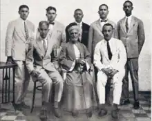 First graduates of the Kitchener School of Medicine, 1928. In the centre is Ahmed Bey Hashim Al Baghdadi (d. 1933) had left all of his fortune to the Kitchener School of Medicine.[1] Standing from left to right: Tahir Yousif, Ahmed Akasha, Fadil Al Bushra, Daoud Iskander, Al Nour Shams Al Din. Sitting from left to right Ali Badri, Hashim Bey Al Baghdadi, Amin Al Sayed.
