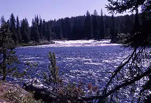 Fall River rises on the Madison and Pitchstone Plateaus in the southwest corner of Yellowstone National Park, Wyoming and flows approximately 64 miles (103 km)[3] to its confluence with the Henrys Fork of the Snake River near Ashton, Idaho. Historically, the river was referred to as the Middle Fork of the Snake River[4] or as Fall River or the Falls River by trappers and prospectors as early as the 1830s.[5] It was officially named the Falls River by the 1872 Hayden Geological Survey, but was always called Fall River by the locals[6] and so the U.S. Board on Geographic Names changed the official name to Fall River in 1997 at the request of Idaho authorities.[1] The river is home to numerous waterfalls and cascades in its upper reaches.