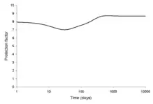 ![]() The protection factor provided by 30 cm of concrete shielding where the source is the idealised Chernobyl fallout.[40] |