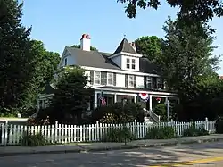 The town of Falmouth was settled in about 1660, but was not set off from Barnstable until 1686. Its first town center was about 0.75 miles (1.21 km) south of the present green, and the 1756 relocation of the meeting house to this area was the subject of much debate. This move spurred the construction of houses along what is now Locust Street, which connected the new center to the south coast, and adjacent to the meeting house, where seven houses survive from that period.[2] Of particular note are the Museums on the Green,[3] owned and operated by the Falmouth Historical Society, with two historic houses and an exhibit center presenting the history of Falmouth, in a setting of gardens by the Falmouth Garden Club. The First Congregational Church, built in 1796, was originally located on the green, but was moved to its north side in 1858. Its belfry houses a bell manufactured by Paul Revere. The green continues to be a major gathering place for civic functions.[2]