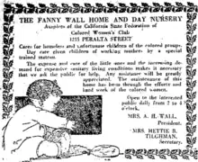 Wall was 'the motivating spirit' behind the creation of the home for black children[3] which later became the Fannie Wall Children's Home and Day Nursery.[1] Plans to establish the Home had begun in 1914 with Wall and Hettie Tilghman, respectively President and Financial Secretary of the Northern Federation of California Colored Women's Clubs.[7] They sought specifically to support black working mothers, care for orphaned black children,[7] and to provide services for African Americans then severely lacking.[3] The Fannie Wall Children's Home and Day Nursery opened in 1918 at 1215 Peralta Street in West Oakland,[7] aiming to 'care for homeless, dependent, neglected children from broken homes, and to provide day care for children of working parents'.[8]