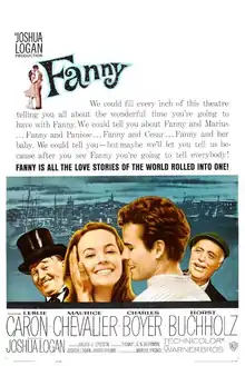 Fanny is a 1961 American Technicolor romantic drama film directed by Joshua Logan. The screenplay by Julius J. Epstein is based on the book for the 1954 stage musical of the same title by Logan and S.N. Behrman, which in turn had been adapted from Marcel Pagnol's trilogy. Pagnol wrote two plays, Marius (1929) and Fanny (1931) and completed the cycle by writing and directing a film, César, in 1936. Meanwhile, Marius (1931) and Fanny (1932) were also produced as films.