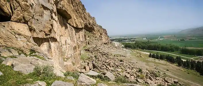 The Farhād Tarāsh (Persian: فرهاد تراش), or Tarāsh-e Farhād,[1] is a long smoothed rock surface on Mount Behistun in western Iran. Located near the famous Behistun Inscription, its height is around 30 meters and its width is around 200 meters.[1] The retaining wall in front of it is c. 150 meters.[1] The work is registered as a national heritage in Iran, and it's the biggest work of such kind in Iran.[1] The Farhād Tarāsh has sparked interest from medieval geographers including Istakhri (died 957) and Yaqut al-Hamawi (died 1229) to travelers and archaeologists in modern times.[1]