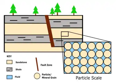 Fault zone hydrogeology is the study of how brittlely deformed rocks alter fluid flows in different lithological settings, such as clastic, igneous and carbonate rocks.[1] Fluid movements, that can be quantified as permeability, can be facilitated or impeded due to the existence of a fault zone.[1] This is because different mechanisms that deform rocks can alter porosity and permeability within a fault zone.[1][2] Fluids involved in a fault system generally are groundwater (fresh and marine waters) and hydrocarbons (Oil and Gas).[3]