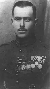 He served as a captain (Yuzbashi) in the 12th Ottoman corps garrison in Mosul, and in several battles during the First World War, including at Qurna in Iraq and at Beersheba in Ottoman Palestine. He was decorated with the Ottoman Majidi Medal for his role in these battles.[4] He was also awarded the German Iron Cross, second class, for his bravery in the battle around Nabi Samwil. The book O Jerusalem! claims he fought alongside General Otto von Kreiss's Prussian unit during this period.[4][5] Al-Qawuqji conducted infiltrations behind British lines to report back directly to General Otto Liman von Sanders,[6] and in his operations, he served as special assistant to a cavalry officer, a certain von Leyser.[7] When his loyalty as an Ottoman officer was questioned because of his Arab origins, von Leyser wrote a letter in his defense, which states: