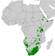 Many taxa assigned to Felicia occur in fynbos and in the Karoo. Some are sand dune specialists, such as F. amelloides and F. amoena, while others prefer to grow on rocky substrate, like F. petiolata and others in the section Neodetris. The East-African annuals can be found in Miombo woodland, while a few, such as F. uliginosa, strongly associate with wet habitats. Further taxa exemplified by F. muricata subsp. cinerascens and the annuals of Namibia, are very drought resistant. The taxon density of Felicia reduces from the south-west to the north-east.[2]