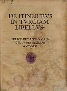 The Quibus itineribus Turci sint aggrediendi ("The Routes By Which the Turks Should Be Attacked") is attributed to Petančić in the first edition published at Vienna by Johannes Cuspinian in 1522 under the title De itineribus in Turciam libellus Felice Petantio cancellario Segniae autore.[19] It was published 23 times down to 1664.[20] No manuscript earlier than the first printing is known. All surviving manuscript copies are based on the printed text. It was a popular work. A German translation was on its third printing in 1558, an Italian translation survives in manuscript from the sixteenth century and Serbian and Croatian translations were published in the nineteenth century.[19]
