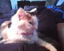 There is a lack of evidence FIP is transmissible from cat to cat although it may explain rare mini-outbreaks of FIP.[8] A study on 59 FIP infected cats found that, unlike FCoV, feces from FIP infected cats were not infectious to laboratory cats via oronasal route.[9] FCoV is common in places where large groups of cats are housed together indoors (such as breeding catteries, animal shelters, etc.). The virus is shed in feces, and cats become infected by ingesting or inhaling the virus, usually by sharing cat litter trays, or by the use of contaminated litter scoops or brushes transmitting infected microscopic cat litter particles to uninfected kittens and cats.[10] FCoV can also be transmitted through different bodily fluids. The virus is easily spread through direct contact between cats. The most common form of spreading is through saliva, as most multiple cat homes share food and water dishes.[11] Another major form of spreading is grooming or fighting. When an infected cat grooms a healthy cat, they leave their contaminated saliva on the fur. Later, when the healthy cat goes to groom themselves, they ingest the contaminated saliva and then become infected.[12]