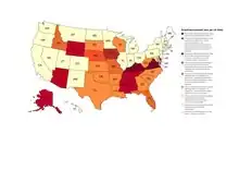 As of 2008, over 5.3 million people in the United States were denied the right to vote due to felony disenfranchisement.[18] In the national elections in 2012, the various state felony disenfranchisement laws together blocked an estimated 5.85 million felons from voting, up from 1.2 million in 1976. This comprised 2.5% of the potential voters in general. The state with the highest number of disenfranchised voters was Florida, with 1.5 million disenfranchised[19] because of a current or previous felony conviction, over 10% of the voting age citizens, including the 774,000 disenfranchised only because of outstanding financial obligations. In October 2020, it was estimated that 5.1 million citizens were disenfranchised for the 2020 presidential election on account of a felony conviction, 1 in 44 citizens.[3]