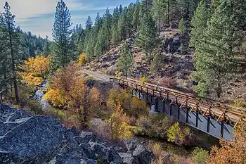 In Fernley, the Fernley and Lassen Railway Depot has been restored[3] as has the depot in Susanville.[4] From Susanville to Westwood, the right-of-way, including the grading and original bridges, has been converted into the Bizz Johnson Trail, a National Recreation Trail.[5]