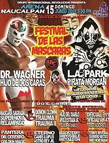 The wrestling mask has always held a sacred place in lucha libre, carrying with it a mystique and anonymity beyond what it means to wrestlers elsewhere in the world.[2] The ultimate humiliation a luchador can suffer is to lose a Lucha de Apuestas, or bet match. Following a loss in a Lucha de Apuesta match the masked wrestler would be forced to unmask, state their real name and then would be unable to wear that mask while wrestling anywhere in Mexico.[3] Since 2007 the Mexican wrestling promotion International Wrestling Revolution Group (IWRG; Sometimes referred to as Grupo Internacional Revolución in Spanish) has held a special annual show where they received a waiver to the rule from the State of Mexico Wrestling Commission and wrestlers would be allowed to wear the mask they previously lost in a Lucha de Apuestas. The annual Festival de las Máscaras ("Festival of the Masks") event is also partly a celebration or homage of lucha libre history with IWRG honoring wrestlers of the past. The IWRG's Festival de las Máscaras shows, as well as the majority of the IWRG shows in general, are held in "Arena Naucalpan", owned by the promoters of IWRG and their main arena. The 2012 Festival de las Máscaras show was the sixth year in a row IWRG held the show.