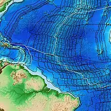The Fifteen-Twenty or 15°20' Fracture Zone (FTFZ), also known as the Cabo Verde Fracture Zone, is a fracture zone located on the Mid-Atlantic Ridge (MAR) in the central Atlantic Ocean between 14–16°N. It is the current location of the migrating triple junction marking the boundaries between the North American, South American, and Nubian plates.[1][2] The FTFZ is roughly parallel to the North and South America—Africa spreading direction and has a broad axial valley produced over the last ten million years by the northward-migrating triple junction.[1][2] Offsetting the MAR by some 175 km, the FTFZ is located on one of the slowest portions of the MAR where the full spreading rate is 25 km/Myr.[3]