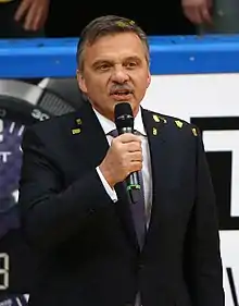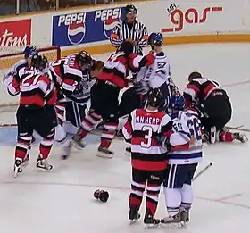 Despite the bans, there have been fights in European leagues. In 2001, a game between the Nottingham Panthers and the Sheffield Steelers in the British Superleague saw "some of the worst scenes of violence seen at a British ice hockey rink".[50] When Sheffield enforcer Dennis Vial crosschecked Nottingham forward Greg Hadden, Panthers enforcer Barry Nieckar subsequently fought with Vial, which eventually escalated into a 36-man bench-clearing brawl. Referee Moray Hanson sent both teams to their locker rooms and delayed the game for 45 minutes while tempers cooled and the officials sorted out the penalties. Eight players and both coaches were ejected, and a British record total of 404 penalty minutes were incurred during the second period. The league handed out 30 games in suspensions to four players and Steelers' coach Mike Blaisdell and a total of £8,400 in fines.[50][51][52] Russia's Kontinental Hockey League (KHL) had a bench-clearing brawl between Vityaz Chekhov and Avangard Omsk in 2010. Officials were forced to abandon the game as there were only four players left. Thirty-three players and both teams' coaches were ejected, and a world record total of 707 penalty minutes were incurred during the game.[53][54] The KHL imposed fines totaling 5.7 million rubles ($191,000), suspended seven players, and counted the game as a 5–0 defeat for both teams, with no points being awarded.[55]