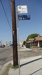 Metro Local Line 81 bus stop at Figueroa and 65th Streets, Los Angeles, California. Metro Local Line 81 runs on Figueroa Street.