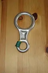 The figure 8 belay device is a piece of metal (usually an aluminum alloy) in the shape of an 8 with one large end and one small end.
