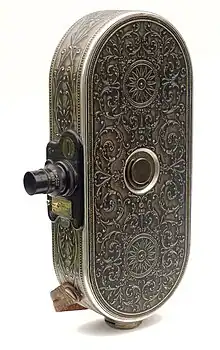 The Filmo 70 was the first spring motor-driven 16 mm camera. In 1925 the Eyemo, a hand-held 35 mm camera based on the design of the Filmo 70 was offered. It was also spring driven, but could be hand-cranked as well. Bell & Howell introduced the first 16 mm turret camera with its Model C in 1927. A beautifully ornate and much more compact 16mm camera, the Filmo 75, marketed primarily as a "watch-thin" ladies' camera, was offered in 1928, followed in 1931 by a nearly identical counterpart designated as the Filmo Field Camera, offered initially in a plain covering, but also available with the ornate decorations of the Model 75, and in that form indistinguishable from the earlier version except for the nameplate.