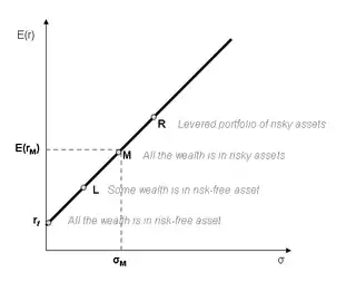 In general, then, while portfolio theory studies how investors should balance risk and return when investing in many assets or securities, the CAPM is more focused, describing how, in equilibrium, markets set the prices of assets in relation to how risky they are. [note 9] This result will be independent of the investor's level of risk aversion and assumed utility function, thus providing a readily determined discount rate for corporate finance decision makers as above,[31] and for other investors. The argument proceeds as follows: If one can construct an efficient frontier – i.e. each combination of assets offering the best possible expected level of return for its level of risk, see diagram – then mean-variance efficient portfolios can be formed simply as a combination of holdings of the risk-free asset and the "market portfolio" (the Mutual fund separation theorem), with the combinations here plotting as the capital market line, or CML. Then, given this CML, the required return on a risky security will be independent of the investor's utility function, and solely determined by its covariance ("beta") with aggregate, i.e. market, risk. This is because investors here can then maximize utility through leverage as opposed to pricing; see Separation property (finance), Markowitz model § Choosing the best portfolio and CML diagram aside. As can be seen in the formula aside, this result is consistent with the preceding, equaling the riskless return plus an adjustment for risk.[5] A more modern, direct, derivation is as described at the bottom of this section; which can be generalized to derive other equilibrium-pricing models.