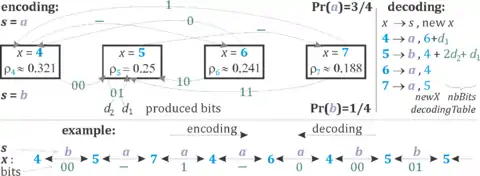 Asymmetric numeral systems (ANS)[1][2] is a family of entropy encoding methods introduced by Jarosław (Jarek) Duda[3] from Jagiellonian University, used in data compression since 2014[4] due to improved performance compared to previous methods.[5] ANS combines the compression ratio of arithmetic coding (which uses a nearly accurate probability distribution), with a processing cost similar to that of Huffman coding. In the tabled ANS (tANS) variant, this is achieved by constructing a finite-state machine to operate on a large alphabet without using multiplication.