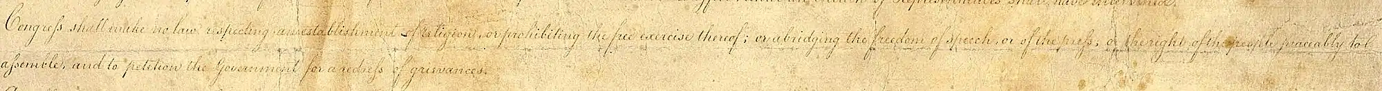 Congress shall make no law respecting an establishment of religion, or prohibiting the free exercise thereof; or abridging the freedom of speech, or of the press; or the right of the people peaceably to assemble, and to petition the Government for a redress of grievances.[4]