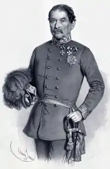 Görgey, who had installed his headquarters in Győr after the battle there, ordered Damjanich's III Corps to advance towards Léva on 11 April, and Klapka's I Corps on the 12th. Their place in Vác was taken by VII Corps under András Gáspár, then after that too departed on the same way, Vác was occupied by György Kmety's division.[11] On 15–17 April the Hungarian army consisting of Klapka's I Corps, Damjanich's III Corps, and two divisions of VII Corps reached the Garam river, under the overall leadership of General Artúr Görgei.[12] Here, on 19 April, at Nagysalló, they met with the troops of Lieutenant General Ludwig von Wohlgemuth and his new imperial troops mustered from the following Habsburg hereditary lands: Styria, Bohemia, Moravia and the capital Vienna, and reinforced with Jablonowski's division (which had fought in the Battle of Vác 10 days earlier). The imperials were defeated and retreated towards Érsekújvár.[13] The Hungarian victory of Nagysalló brought about serious results. It opened the way towards Komárom, bringing its relief to within just a couple of days’ march.[13] At the same time it put the imperials in the situation of being incapable of stretching their troops across the very large front which this Hungarian victory created, so instead of uniting their troops around Pest and Buda, as they had planned, Feldzeugmeister Welden had to order the retreat from Pest which was in danger of being caught in the Hungarian pincers.[13] When he learned about the defeat on the morning of 20 April, he wrote to Lieutenant General Balthasar Simunich, the commander of the forces besieging Komárom, and to Prince Felix of Schwarzenberg, the Minister-President of the Austrian Empire, telling them that in order to secure Vienna and Pozsony from a Hungarian attack he was forced to withdraw the imperial forces from Pest and even from Komárom.[14] He also wrote that the morale of the imperial troops was very low, and because of this they could not fight another battle for a while without suffering another defeat.[15] So the next day he ordered the evacuation of Pest, leaving a substantial garrison in the fortress of Buda to defend it against Hungarian attack. He ordered Jelačić to remain for a while in Pest, and then to retreat towards Eszék in Bácska, where the Serbian insurgents, allied with the Austrians, were in a grave situation after the victories of the Hungarian armies led by Mór Perczel and Józef Bem.[16]