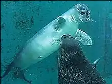 The idea of creating a Danish fisheries museum with an aquarium came from the journalist Hakon Mielche in 1941. In 1962, a planning committee was formed in Esbjerg which soon led to the collection of artefacts.[3] Building began in 1966, allowing the privately owned institution to be opened to the public in 1968. From the start, the museum contained a fisheries exhibition and a saltwater aquarium. A sealarium was added in 1976. In 1989 a start was made on an outdoor exhibition which was later extended. The museum established a research unit in 1994, followed in 2000 by the Centre for Maritime and Regional Studies (Center for Maritime og Regionale Studier), a cooperative venture with the University of Southern Denmark. In 1999, a five-storey museum building with almost 2,000 m2 (22,000 sq ft) of floor space was inaugurated, housing a new permanent exhibition, a library, storage rooms, an archive and offices. Provision was also made for temporary exhibitions while the educational facilities were modernized. A new saltwater aquarium was installed in 2002 and a new "sealarium" (exhibit for seals) in 2013.[2] The largest aquarium tank contains 100,000 L (26,000 US gal) saltwater and is home to species such as cod, halibut, conger eel, gilthead seabream, greater spotted dogfish and thornback ray,[4] while the sealarium contains 500,000 L (130,000 US gal) and is home to grey seal and harbour seal.[5]