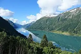 Fjærlandsfjorden is a fjord in Vestland county, Norway. It is a fjord arm that branches off the main Sognefjorden to the north, running through Sogndal Municipality. The 25-kilometre (16 mi) long fjord begins at the village of Fjærland in Sogndal, flowing to the south until it joins the Sognefjorden near the village of Balestrand. The Esefjorden and Vetlefjorden are two small fjord arms that branch off the Fjærdlandsfjorden. The fjord is about 1.5 kilometres (0.93 mi) wide, with steep mountains on both sides of the fjord. The head of the fjord is the only habitable area around the fjord. It is a flat river valley extending north of the fjord. The inner part of the fjord where the village of Fjærland is located is only accessible by boat or via long road tunnels through the surrounding mountains. The western end of the Frudal Tunnel sits very near the shore of the fjord.[1]