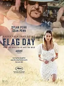 Flag Day is a 2021 American drama film directed by and starring Sean Penn based on Jennifer Vogel's 2004 memoir, Flim-Flam Man: A True Family History.[4] It premiered in competition at the 2021 Cannes Film Festival[5] and was released in cinemas on August 20, 2021 by United Artists Releasing. The film has received mixed reviews from critics.