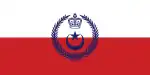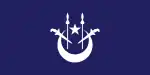 State and war ensignA blue field with a white crescent and star and two white kris and spears in a red canton.