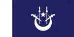 Flag of the Menteri BesarA blue flag with a white hoist, with a white crescent and star and two white kris and spears charged on the fly.