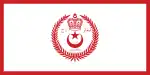pre 2010Royal standard of the SultanA white flag with the royal arms in blue (a blue star and upward pointing crescent surmounted by a coronet similar to that from the arms, surrounded by a blue wreath) charged on the centre; an older, more intricate variant of the flag features a yellow star and crescent, a yellow crown, and a blue wreath.