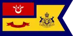 Flag of the BendaharaA blue flag with a yellow hoist, with a white crescent and star and two white kris and spears charged on the fly.