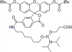 Fluorescein amidites, abbreviated as FAM, are important synthetic equivalents of fluorescein dye used in oligonucleotide synthesis and molecular biology. FAM is used in the preparation of fluorescein-labeled oligonucleotide probes for the detection of the presence of the complementary nucleic acids or primers for polymerase chain reaction. Oligonucleotides labeled with fluorescein at one of the termini and with a quencher at the other can serve as molecular beacons.