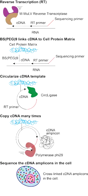 In FISSEQ, a series of biochemical processing steps, such as DNA ligations or single-base DNA polymerase extensions, are performed on a block of fixed tissue, interlaced with fluorescent imaging steps. The process is conceptually identical to the mechanism of fluorescent sequencing by synthesis in a commercial bulk DNA sequencing machine, except that it is performed in fixed tissue. Each DNA or RNA molecule in the sample is first “amplified” (i.e., copied) in-situ via rolling-circle amplification to create a localized “rolling circle colony” (rolony) consisting of identical copies of the parent molecule. A series of biochemical steps are then carried out. In the kth cycle, a fluorescent tag is introduced, the color of which corresponds to the identity of the kth base along the rolony’s parent DNA strand. The system is then “paused” in this state for imaging. The entire sample can be imaged in each cycle. The fluorescent tags are then cleaved and washed away, and the next cycle is initiated. Each rolony – corresponding to a single “parent” DNA or RNA molecule in the tissue – thus appears across a series of fluorescent images, as a localized “spot” with a sequence of colors corresponding to the nucleotide sequence of the parent molecule. The nucleotide sequence of each DNA or RNA molecule is thus read out in-situ via fluorescent microscopy.