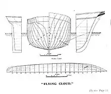 A reporter for the Boston Daily Atlas of 25 April 1851 (~$2.53 million in 2022) wrote, "If great length [235 ft.], sharpness of ends, with proportionate breadth [41 ft.] and depth, conduce to speed, the Flying Cloud must be uncommonly swift, for in all these she is great. Her length on the keel is 208 feet, on deck 225, and over all, from the knightheads to the taffrail, 235— extreme breadth of beam 41 feet, depth of hold 21½, including 7 feet 8 inches height of between-decks, sea-rise at half-floor 20 inches, rounding of sides 6 inches, and sheer about 3 feet."[3] Flying Cloud is often called an extreme clipper, as are many of Donald McKay's ships, even though her deadrise was only 30 inches.[4]
