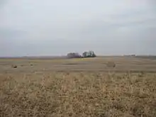 Typical topography surrounding Fonda, 3 miles (5 km) south of town. Note the ridges on either side of a drained prairie pothole, a center of photo.