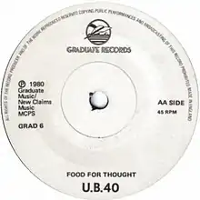 "Food for Thought" is a song by British reggae band UB40, released as their debut single in February 1980 from their album Signing Off. Released as a double A-side with "King", it peaked at number four on the UK Singles Chart.[2]