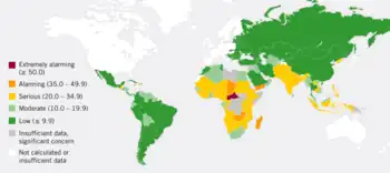 An asterisk (*) indicates that country is considered to be an "extreme hunger" hotspot by Oxfam,[1] as indicated in the July 2020 Oxfam report. These ten key areas of "extreme hunger" that account for 65% of the total population facing crisis-level hunger (IPC phase 3 or above) include Afghanistan, DR Congo, Ethiopia, Haiti, South Sudan, Sudan, Syria, Venezuela, Yemen and the West African Sahel (including Burkina Faso, Chad, Mali, Mauritania, Niger, Nigeria and Senegal).[1][2] It also noted "emerging epicentres" of hunger, alongside famine-stricken areas, in Brazil, India, Yemen, South Africa and the Sahel.[1][2] The United Nations has made an "urgent call" to improve data analytics in several countries which may be at risk, including Congo, North Korea, Eritrea, Kyrgyzstan, Nepal, Philippines and Sri Lanka.[37]