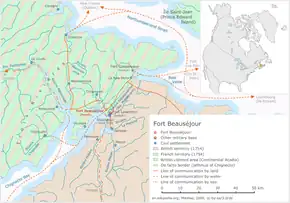 A convoy of 31 transports and three warships left Boston on 19 May 1755, carrying nearly 2,000 New England provincial troops and 270 British regulars, and dropped anchor near the mouth of the Missaguash River on 2 June.[11] The next day the troops, under the command of Lieutenant-Colonel Robert Monckton of the regular army, disembarked a few kilometres from Fort Beauséjour. To defend the fort, Commander Louis Du Pont Duchambon de Vergor had only 150 soldiers from the Compagnies franches de la Marine and a dozen canonniers-bombardiers. On June 16, a large English bomb went through the roof of a casemate and killed many of its occupants. Vergor laid down his weapons. The fort was surrendered, and renamed Fort Cumberland. The next day Fort Gaspereau was surrendered without being attacked. The fall of these forts settled the boundary dispute in favour of the British and marked the beginning of the Expulsion of the Acadians.[9]