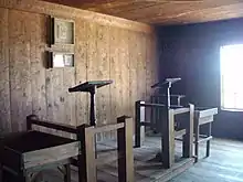 Much archaeological research has been done at Fort Ross, more recently in search of the windmills. The historical record states there were at least three windmills, possibly four, although the fourth may have been a watermill or a man- or animal-powered mill.[38] The windmills have gained much attention because various accounts of their exact locations are sometimes inconsistent and vague. There was, in fact, one windmill located not far from the northern end of the blockade, which was most likely used to grind wheat and barley flour.[38] Based on the descriptions given by people who visited Fort Ross, it has been concluded that the main windmill, located outside the blockade, was the traditional style Russian stolbovki.[38] The root word "stolb" means thick vertical pole.