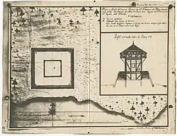 The site of Fort Pupo was excavated in stratigraphic tests by cultural anthropologist John Goggin and students of the University of Florida in 1950 and 1951;[3][4][5] his team's excavations indicated that the original structure of Fort Pupo was little more than a sentry box. A letter written by Royal Engineer Antonio de Arredondo on January 22, 1737 describes it as "a sentry box built of boards, eight feet in diameter… surrounded by a palisade."[6] This diminutive fortification was replaced in 1738 by the construction of a new wooden blockhouse, barracks, and storehouses on the orders of the governor of La Florida, Manuel de Montiano. The work was done under the direction of Engineer Pedro Ruiz de Olano, who pulled a crew of carpenters, sawyers, and axemen from construction of the Castillo de San Marcos, the fortress of St. Augustine, to rebuild the Pupo blockhouse.[7] The architectural plan and profile of the structure are shown in his "Plano y perfil del nuevo fortín de San Francisco de Pupo" (Plan and Profile of Fort San Francisco de Pupo).[8]