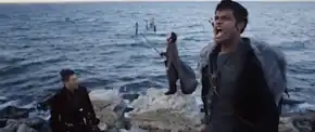 FORTE (l-r: Ryu, Page, Panikkar) frame the ocean off Sands Point, New York, in the music video for their single "Game of Thrones" (2015)