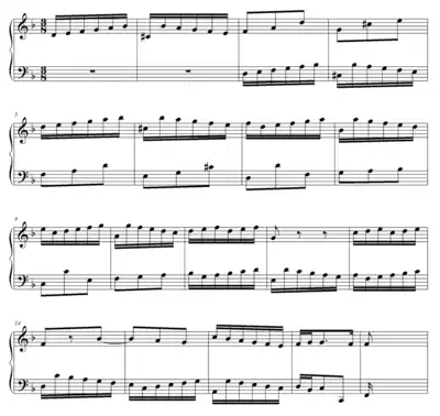 This developmental process and its resulting musical structure are used mainly in the Baroque period. Here is an example of the fortspinnung process in the first section of the Johann Sebastian Bach Invention No. 4 in D minor (BWV 775):[3]