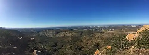There are several routes to the summit of North Fortuna Mountain. More popular routes being those that leave from the area around the Old Mission Dam and proceed up the saddle between North Fortuna and its smaller neighbor South Fortuna before turning to the north up the summit ridge to the North Fortuna Summit. The summit affords those that make it to the top 360-degree views of San Diego, Santee, MCAS Miramar as well as other landmarks such as Cowles Mountain to the immediate south and the Cuyamaca Peak and the Cuyamaca Mountains to the east.[4]