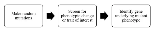 Forward genetics provides researchers with the ability to identify genetic changes caused by mutations that are responsible for individual phenotypes in organisms.[1] There are three major steps involved with the process of forward genetics which includes: making random mutations, selecting the phenotype or trait of interest, and identifying the gene and its function.[4] Forward genetics involves the use of several mutagenesis processes to induce DNA mutations at random which may include: