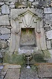 The Fountain of the Iron Waters (Portuguese: Fonte das Águas Ferreas), is a Baroque fountain in the civil parish of Fraião, municipality of Braga. The fountain, with ornate backrest, is located in an L-shaped courtyard, with a zoomorphic spout, niche and contorted frame. The design integrates details approximating decorative elements used by André Soares, most notably the Municipal Hall and Church of the Congregados, highlighting the abilities of master-mason Paulo Vidal. However, this project was actually designed by Carlos Amarante, at the beginning of his career, having been appointed the inspector of public works in 1773.[1]