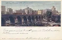 A postcard of the skyline and bridge in Minneapolis, 1906