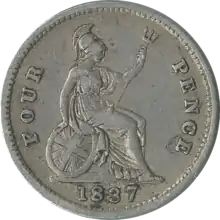 The original reverse of the 1836 version of the coin, designed by William Wyon, is a seated Britannia, holding a trident, with the words FOUR PENCE to each side. Two different obverses were used during the mintage of this coin. Wyon's likeness of William IV appeared in 1836 and 1837, surrounded by the inscription GULIELMUS IIII D G BRITANNIAR REX F D.[9] Groats bearing the likeness of Victoria were issued from late 1837 onwards, also designed by Wyon, with the inscription VICTORIA D G BRITANNIAR REGINA F D. Those fourpences minted in 1888 bear the "jubilee head" of Victoria, designed by Joseph Boehm – the reverse is unchanged.[10]