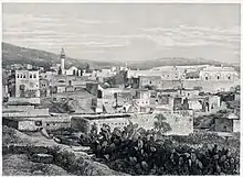 From Cairo, the delegation traveled by land to Jerusalem, where they stayed from December 11 to 14, 1839.[1] During these days, Fesque photographed Jerusalem from the Mount of Olives, including the Temple Mount, the city walls, and its surroundings.[13][14] From Jerusalem the expedition continued to Acre, where Fesque photographed the old city on its rooftops, the people staying there, and the Crusader fortress in the background. Finally, he photographed the city of Nazareth and its surroundings. From Nazareth, the delegation continued to Damascus, Turkey, and returned to Paris at the beginning of 1840.